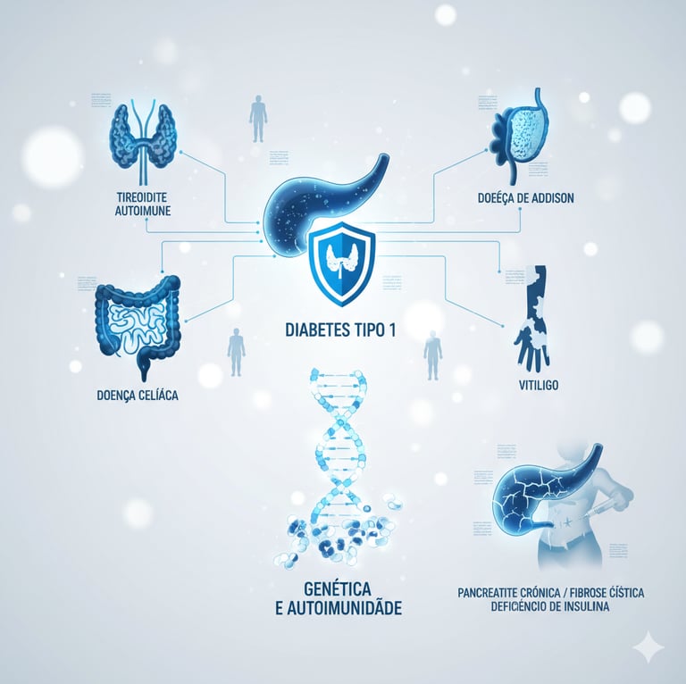 As doenças mais semelhantes ao DM1 podem ser categorizadas em dois grupos principais: outras formas de diabetes com base autoimune e outras doenças autoimunes em geral.